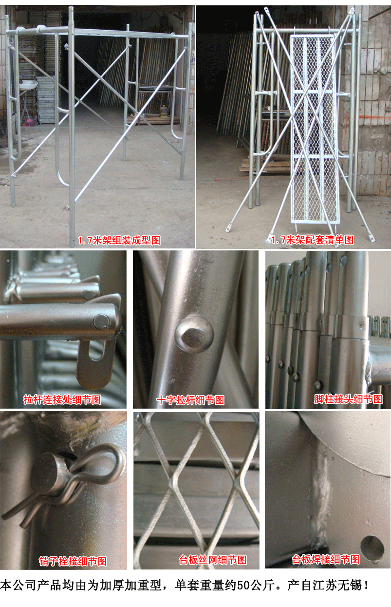 门框架式脚手架也被称为门钢管脚手架,门框架首先构成基本单元,其主要部件包括门框架、交叉支撑和水平梁框架,门杆垂直方向选择连接杆和锁臂高度,垂直使用交叉支撑连接门柱,在顶部平面使用扣脚手板或水平梁框架。这些基本的组合模块相互连接,堆叠高度,上下伸展,然后设置水平加固件、剪刀支撑和墙杆,形成整体的门脚手架。这种脚手架的组成非常简单,尺寸和规格也很多,我们必须根据门脚手架的尺寸来设置。